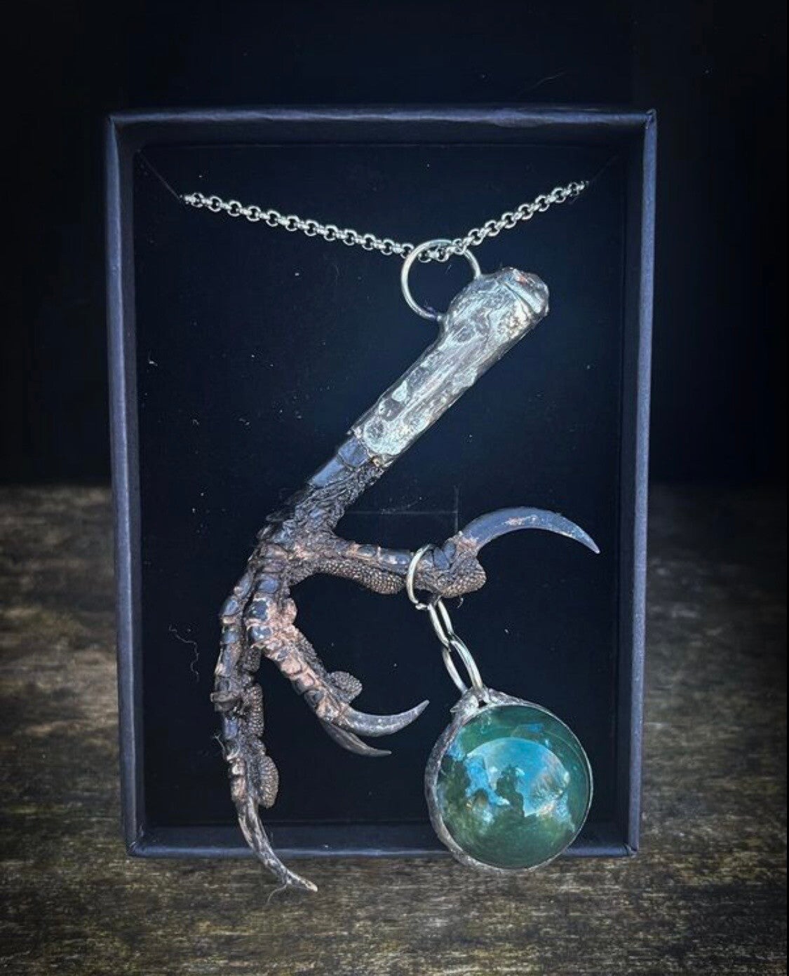 A Single Witches Raven Claw Soldered with a Crystal Orb Talisman on a Silver Belcher Chain