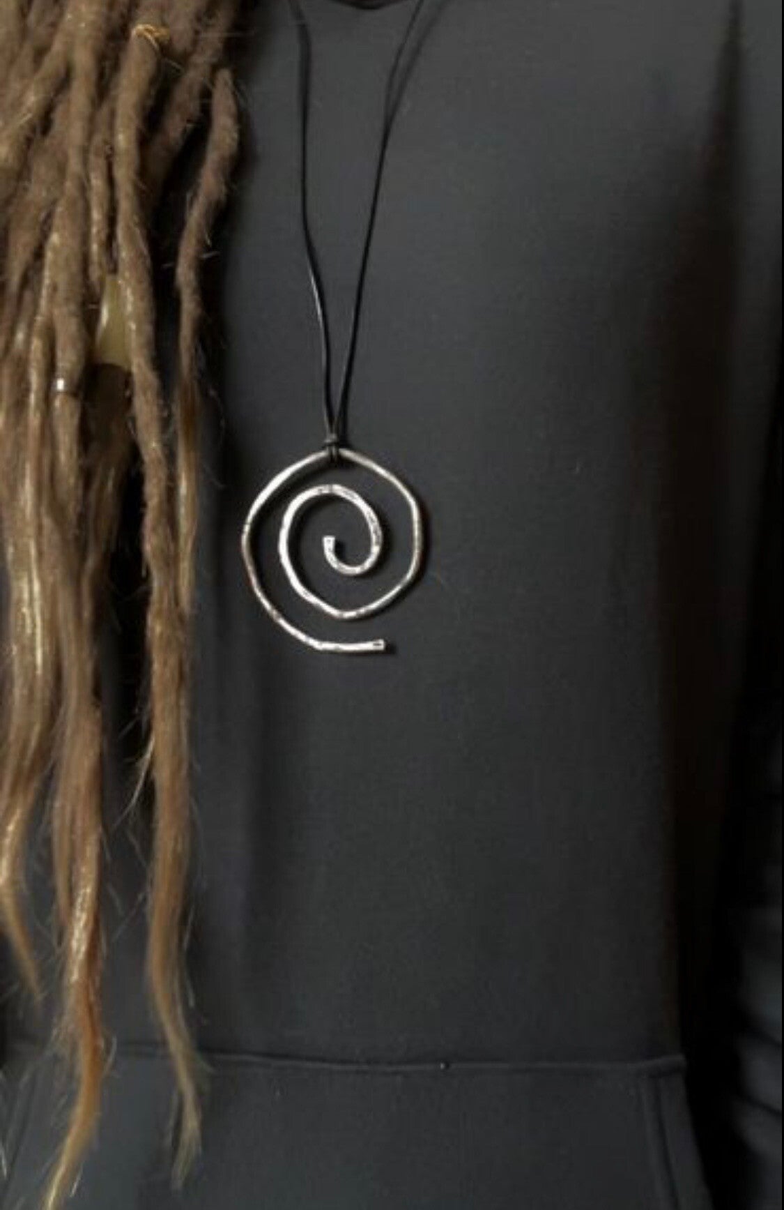 This piece is hammered and darkened in a patina to bring out the texture. Comes on an adjustable leather cord.