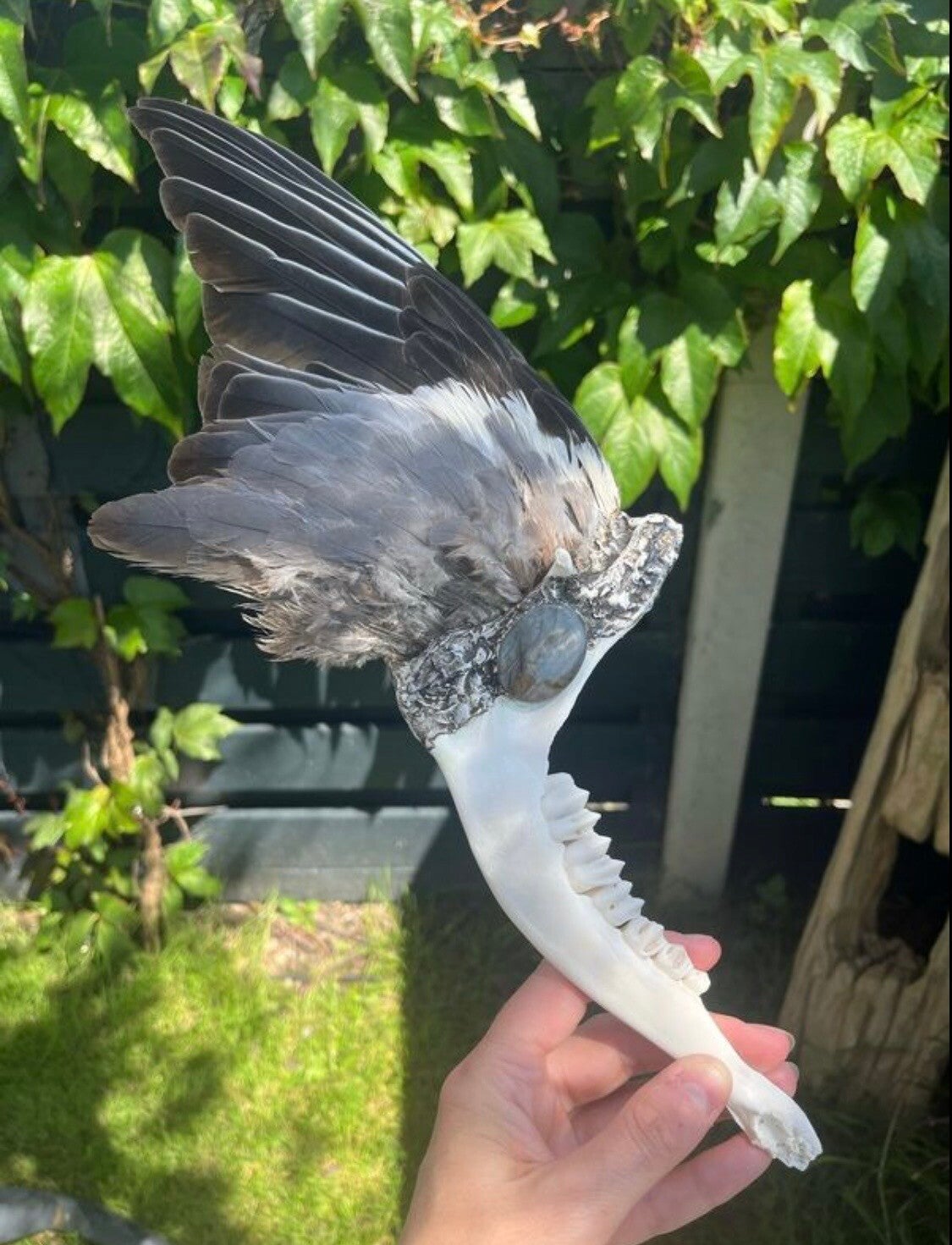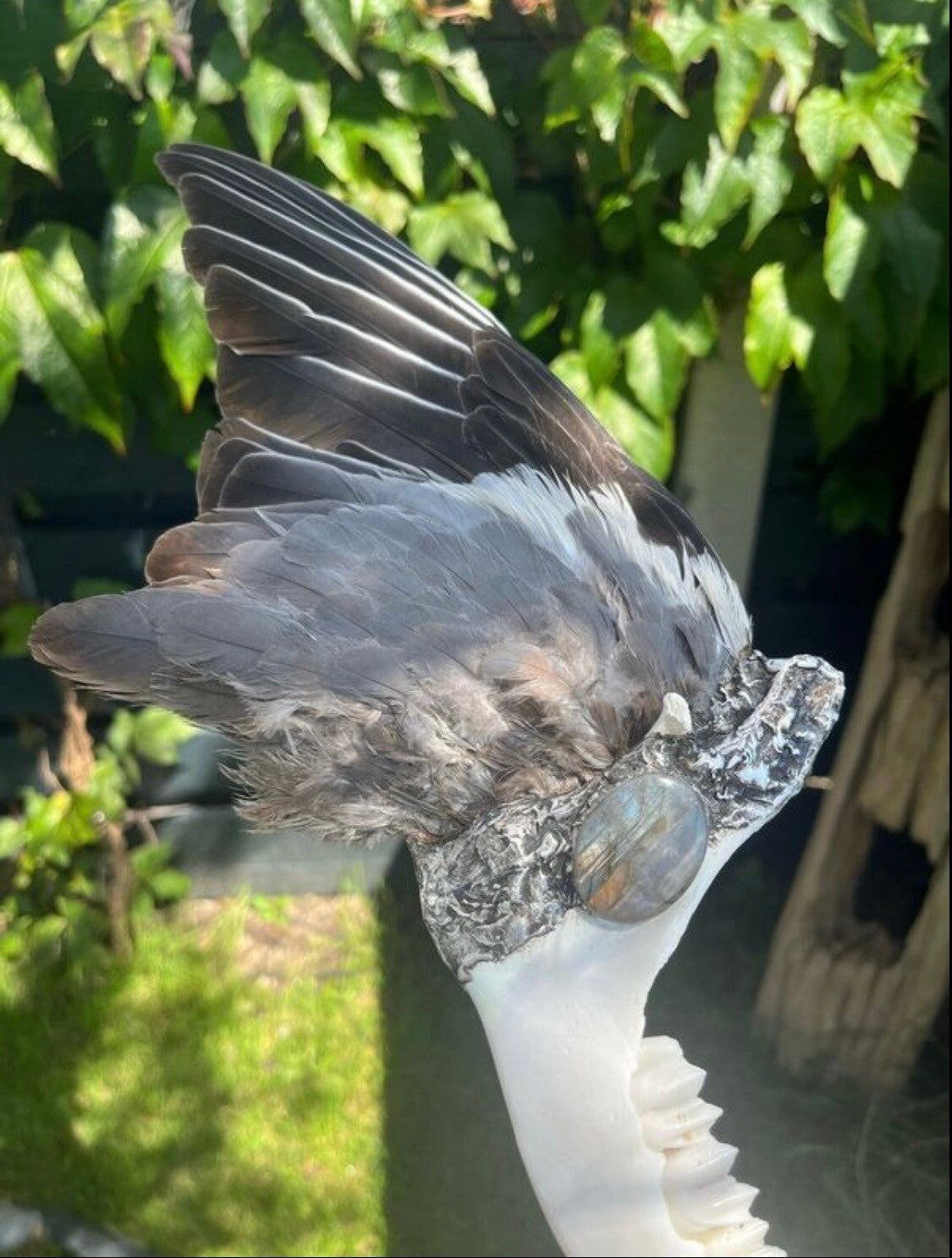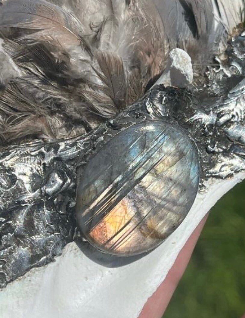 It is made from the most stunning pigeon wing and equally beautiful and incredibly smooth ethically sourced deer jaw bone. A flashy labradorite crystal sits soldered in the middle of this piece.