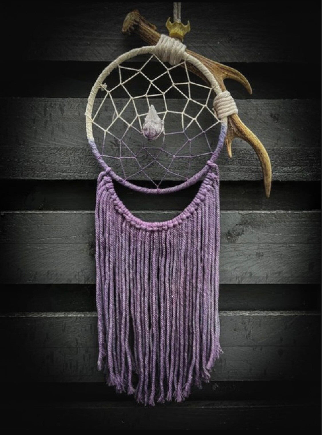 handmade and naturally dyed this cream cotton macrame a beautiful purple using hibiscus and beetroot to match the stunning raw amethyst crystal