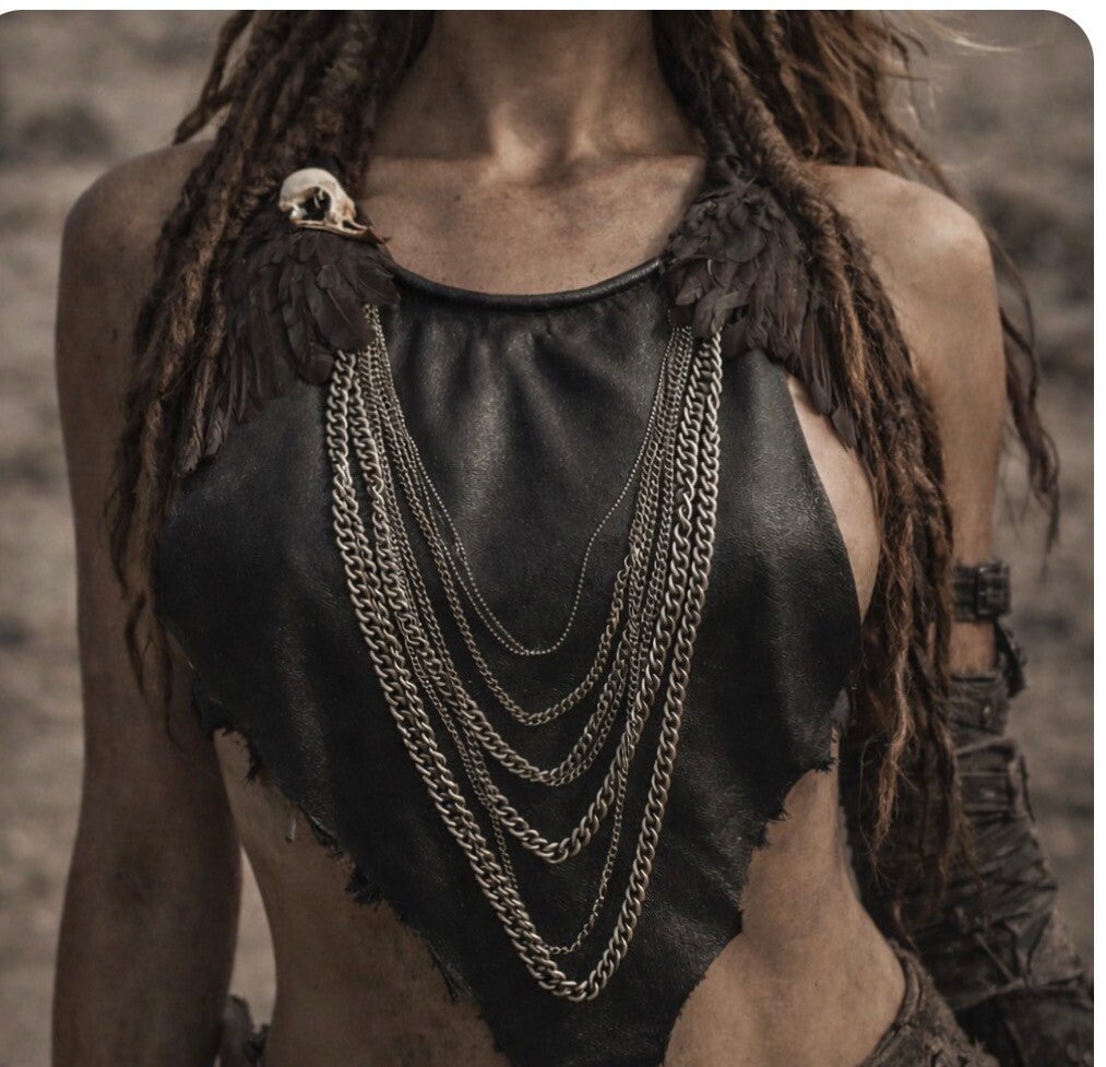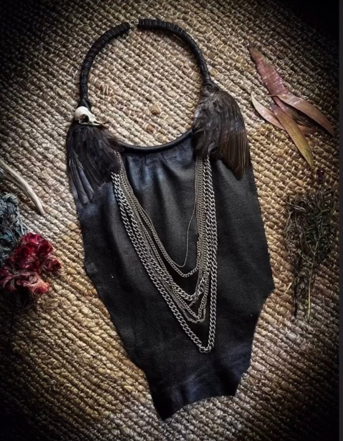 Raw reclaimed leather, layered chains, feathered shoulders and bird skull, every detail designed to command attention.